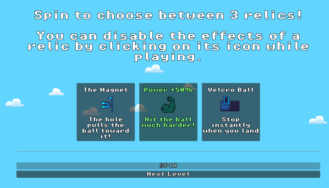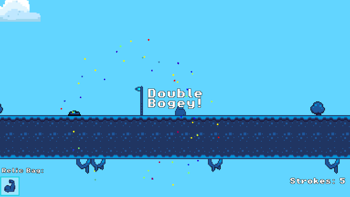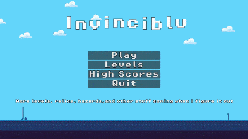 Invinciblu is a golf-like platformer where you whack an invincible little creature towards a flag, obtain relics after levels, and turn the relics on or off to beat the levels par.